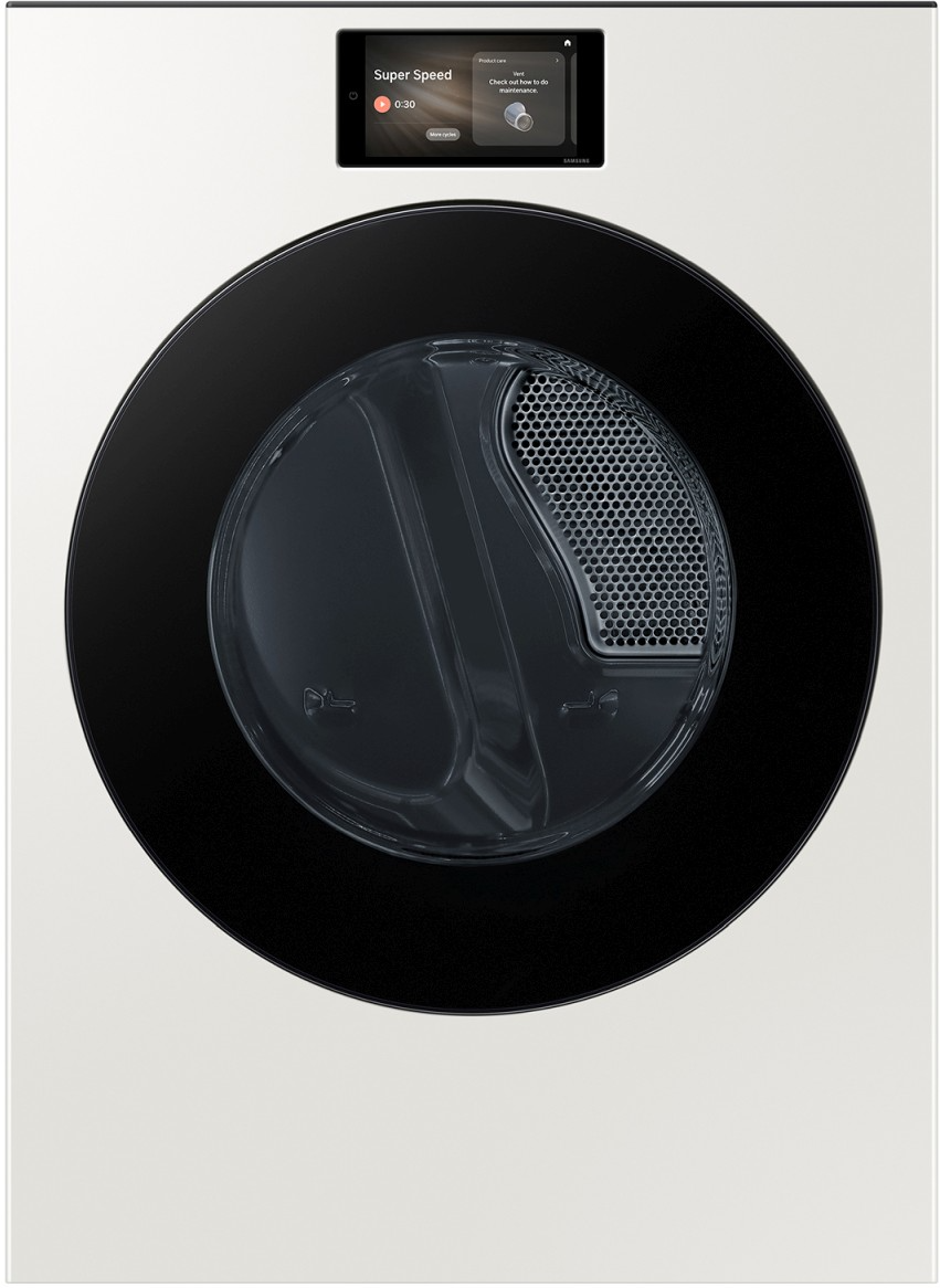 Samsung WF90 Bespoke AI 7.6 Cu. Ft. Ivory Front Load Electric Dryer with AI Home & AI Optimal Dry. The brand-new design is simplified and seamless, with a large 7” LCD display. Its elegant flat front and back fit harmoniously with other appliances and furniture. And you can install a washer and dryer together either horizontally or vertically.Read More